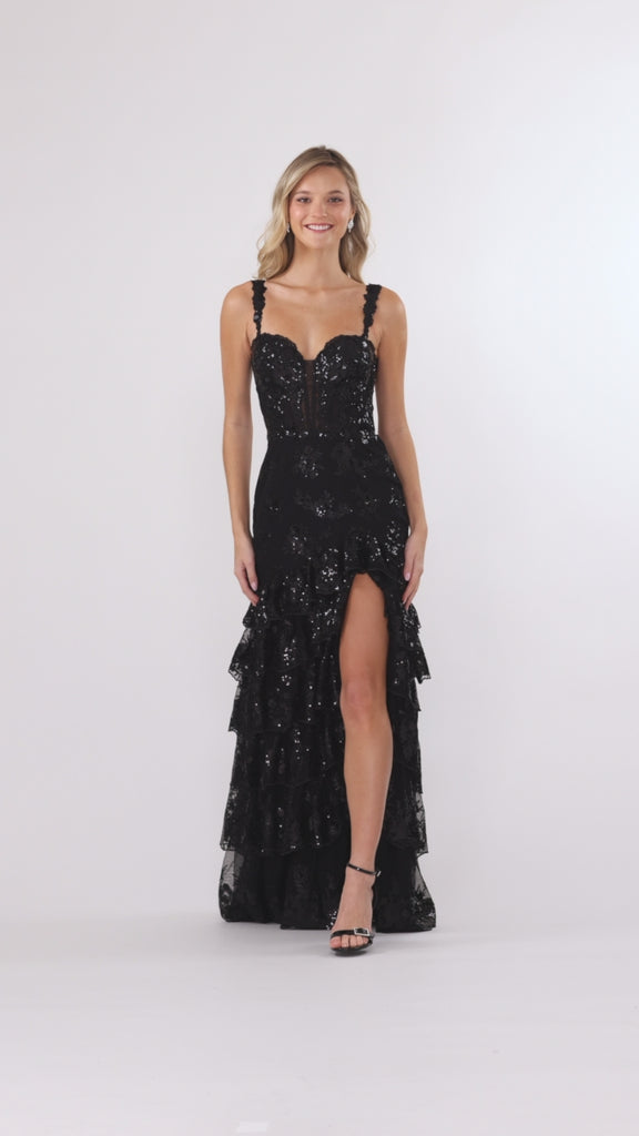 "Tinsley" Sequin and Lace Tiered Floor Length Dress