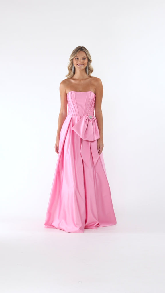 "Jackeline" Satin Strapless Bow Embellished Floor Length Dress