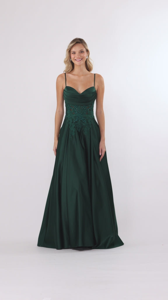 Twirl into the spotlight wearing this breathtaking satin floor-length dress, embellished with an exquisite appliqué that sparkles as you move. Whether you're dancing at prom, or celebrating life's most magical moments, this dress ensures you'll be absolutely unforgettable!